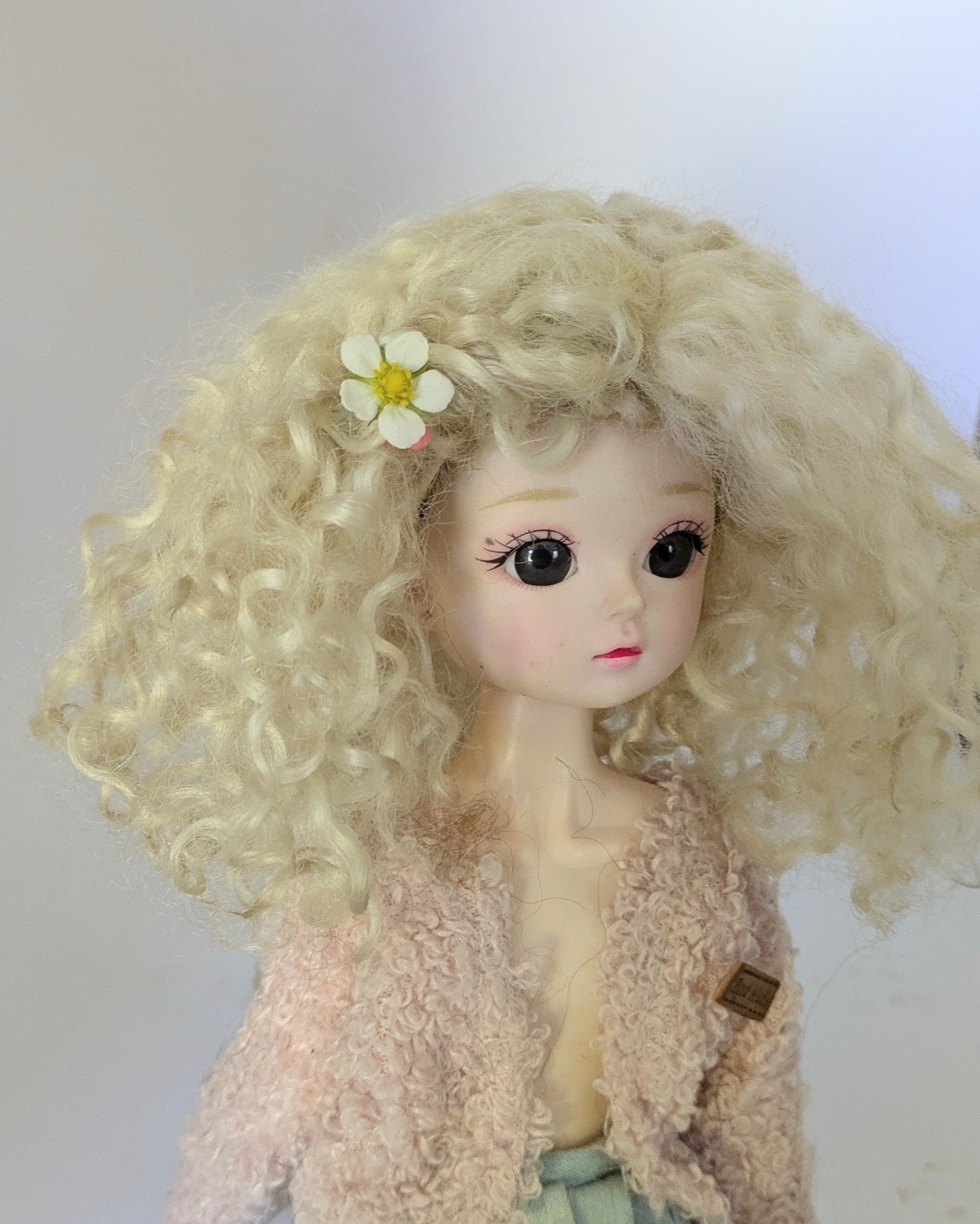 Discover the Teeswater Light Blonde Mid Length Doll Wig, a refined accessory brimming with character. Crafted from soft, curly fibres sourced from long-wool sheep, this wig enhances any doll’s appearance with elegance and texture.