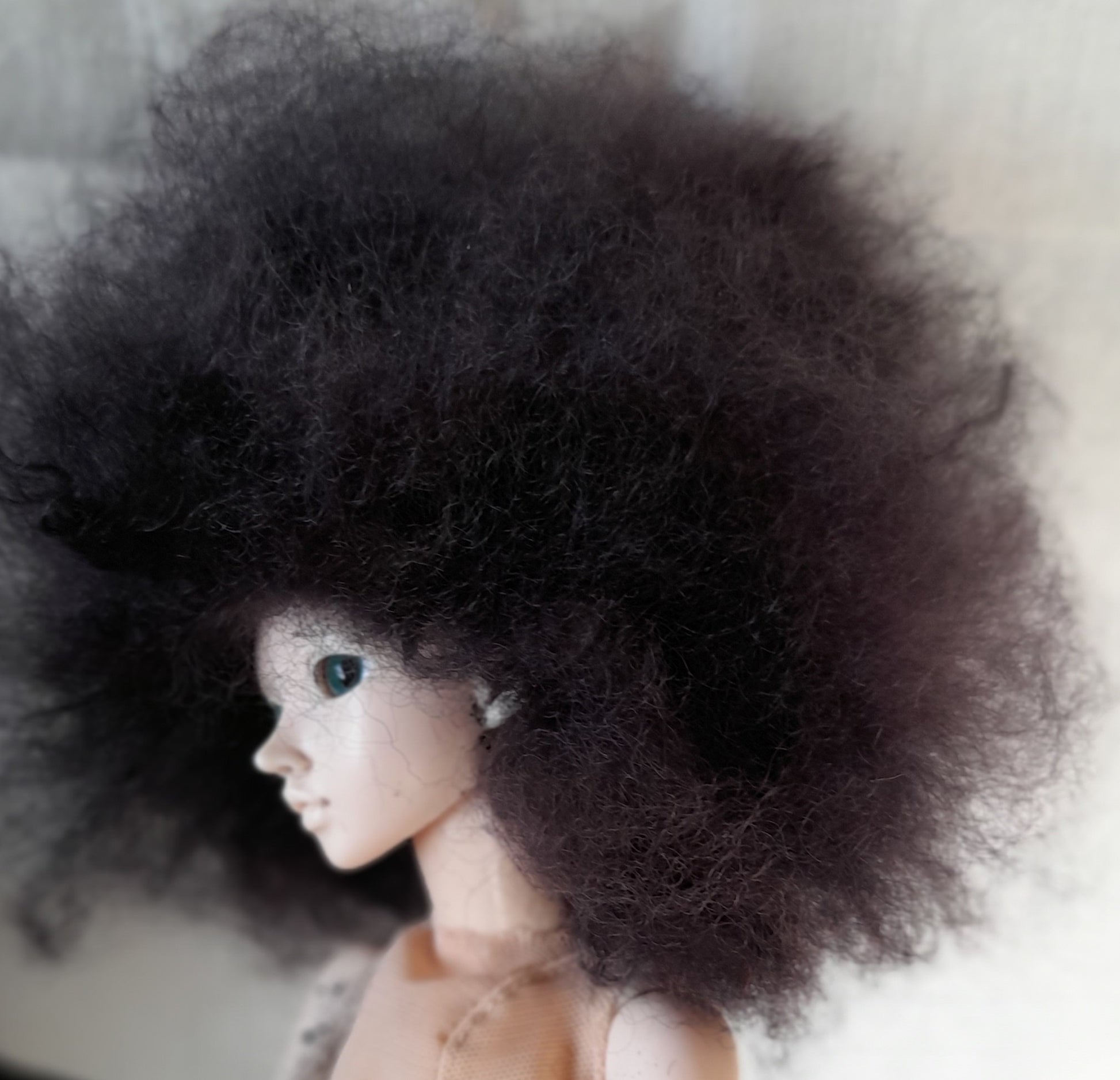 Achieve an adorable appearance with our Black Ryeland 'Afro' Doll wig! Crafted from the soft and fluffy fibres of the Black Ryeland sheep, this wig is ideal for any doll lover.